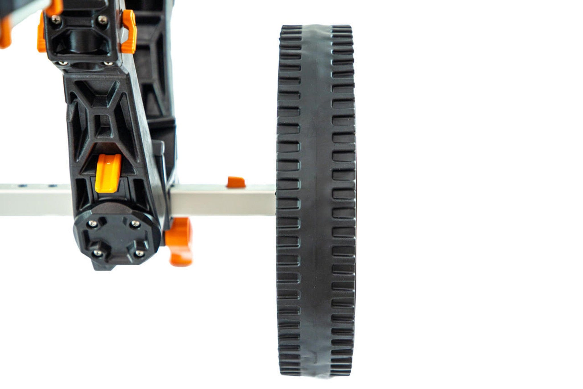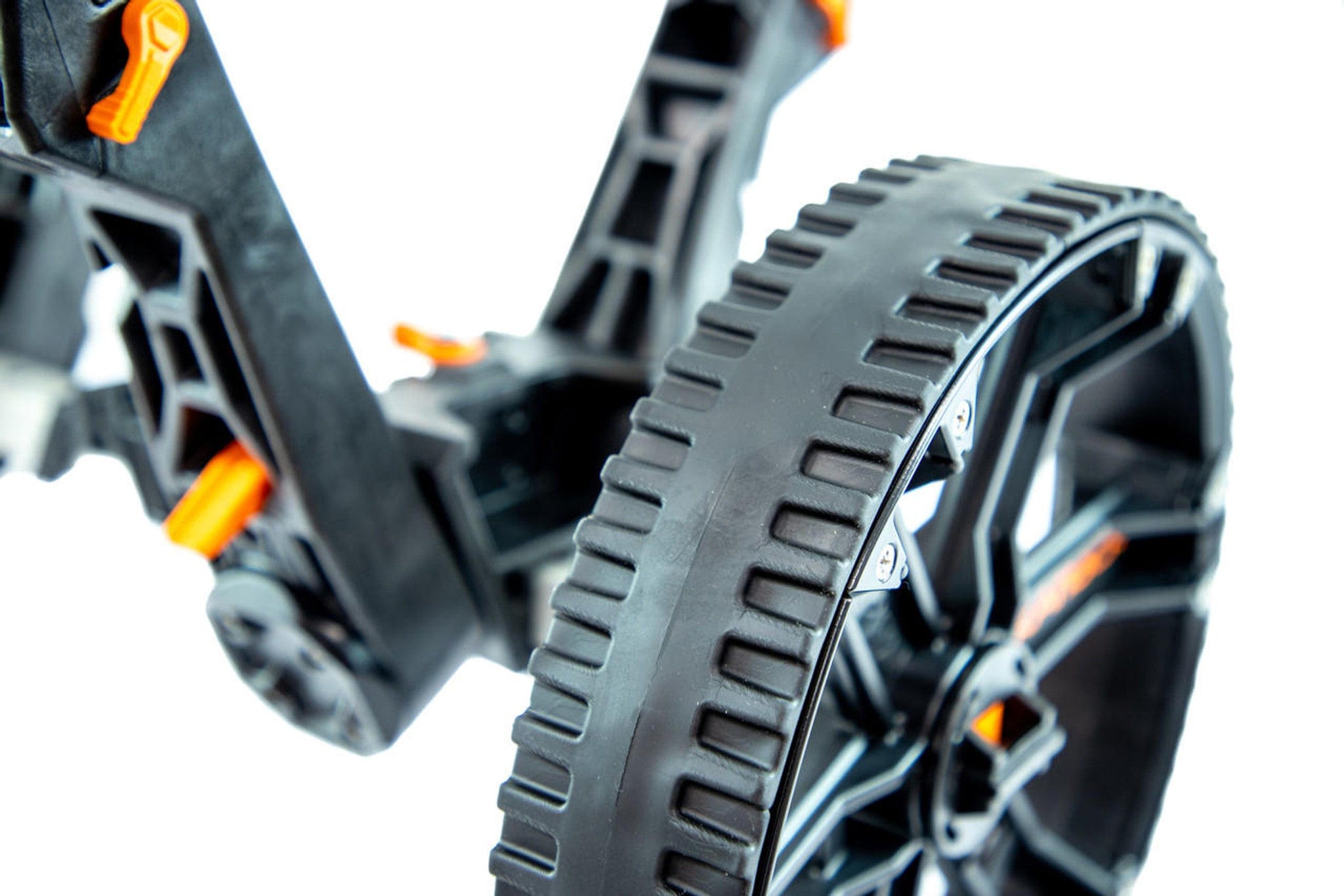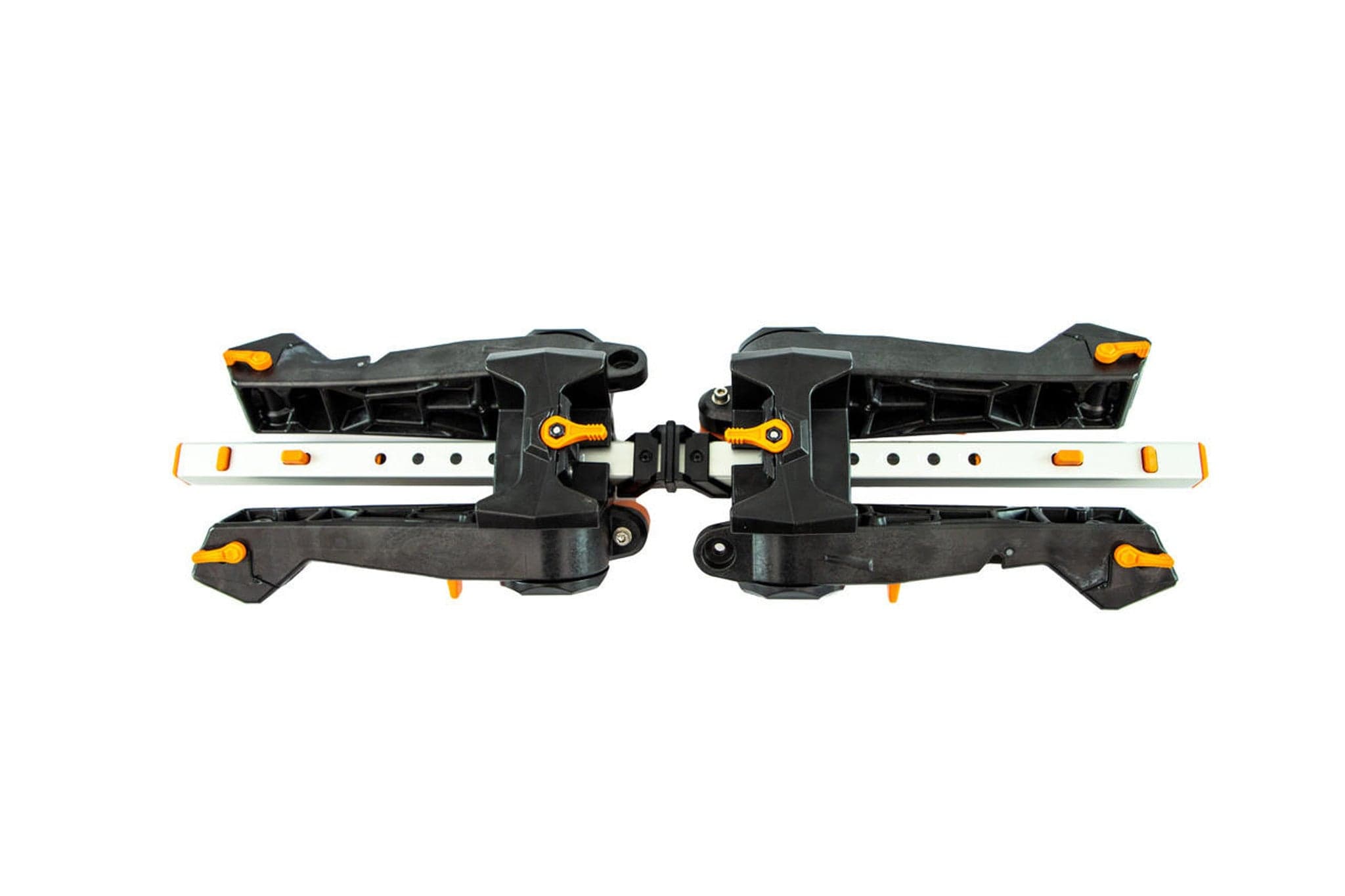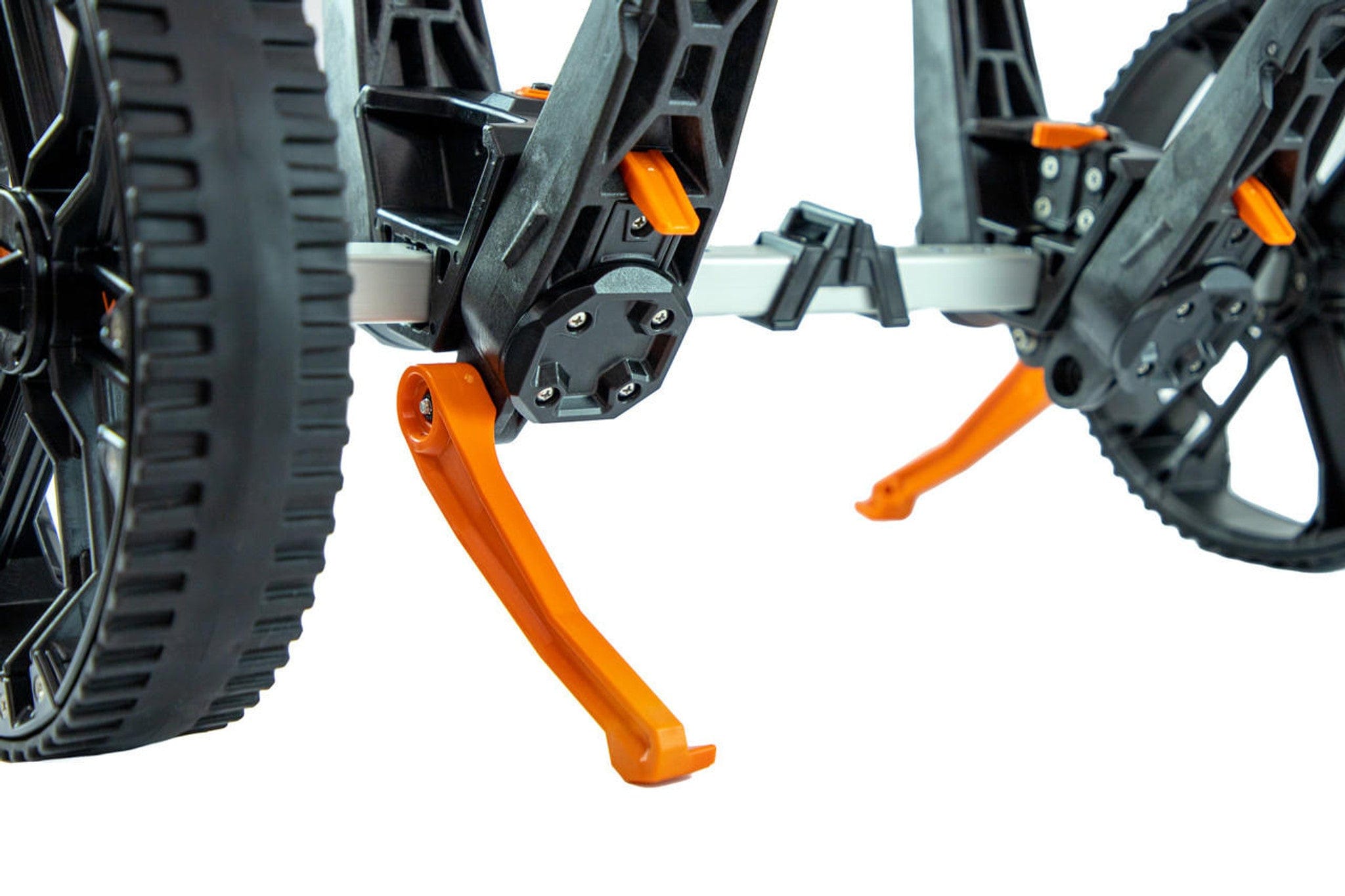 The BarCart comes with two kickstands. When configured with one on each side, you can optimize and support the loading angle for both sides of the cart. When not in use, the beefy kickstands snap in place, locked out of the way.