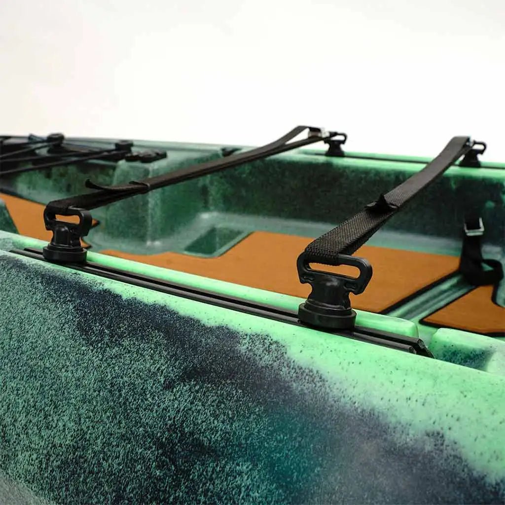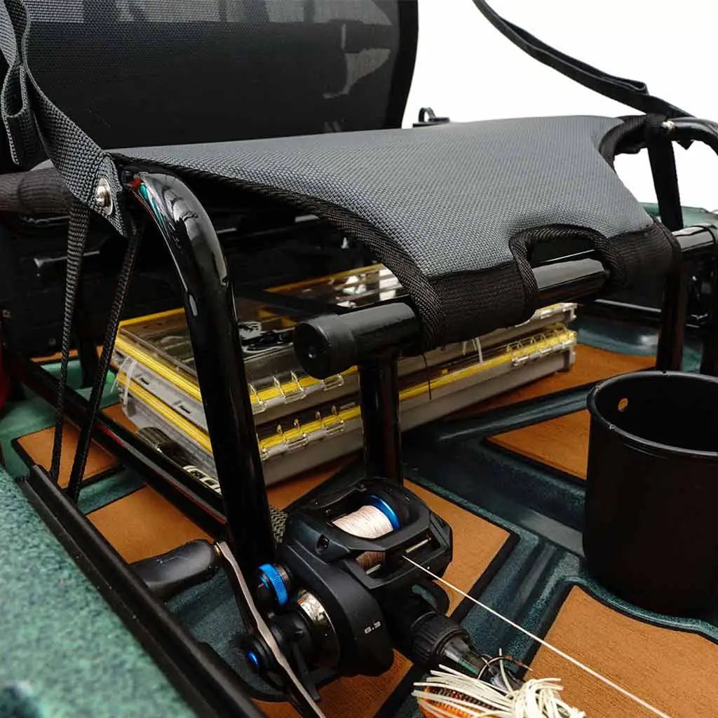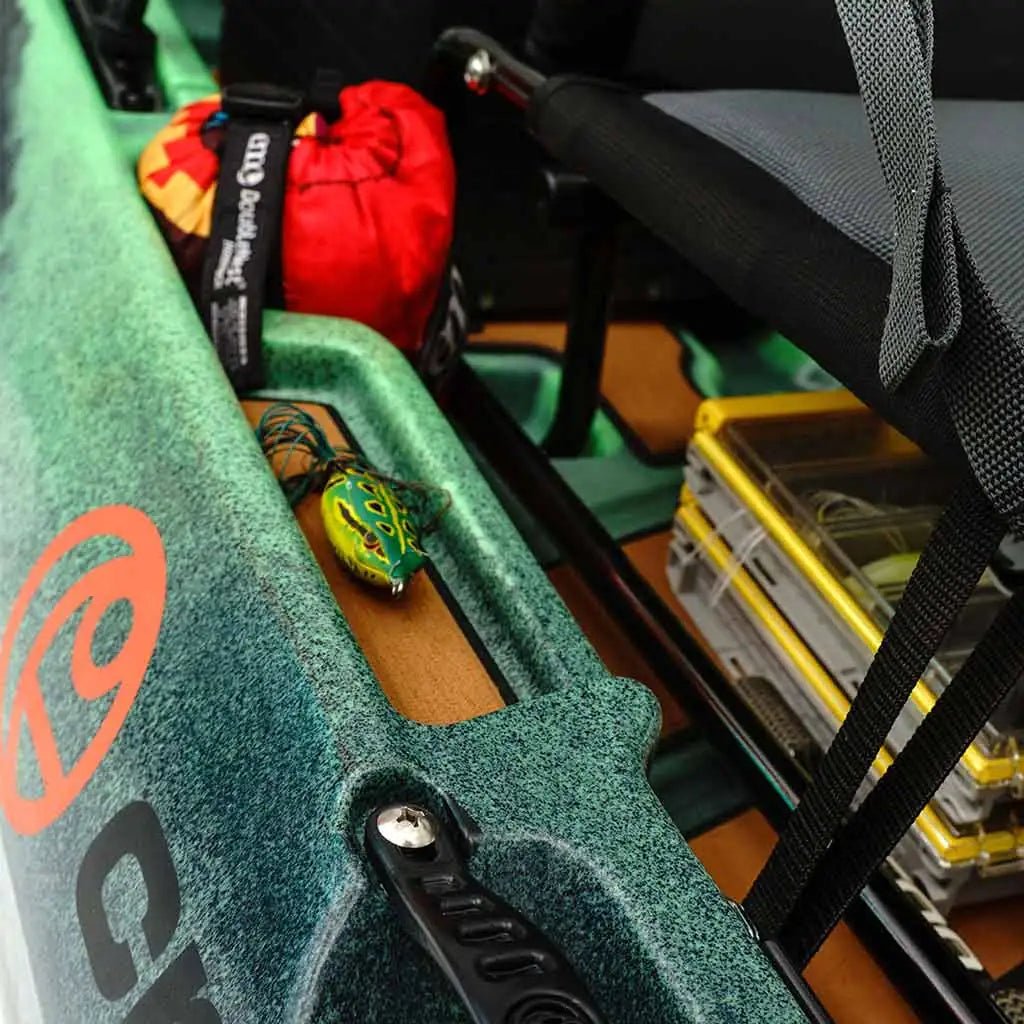 The spacious, open cockpit and the adjustable high-back seat provides exceptional, all-day comfort. The teak deck pad not only looks fantastic – especially in the Moss colorway – but also significantly reduces noise and improves traction, giving you a quieter, more secure fishing platform. Thoughtful details like stash trays, cup holders, additional YakAttack GearTracs, and ample under-seat storage ensure every piece of your gear has its designated place.