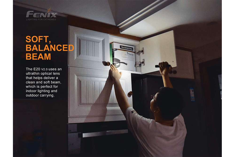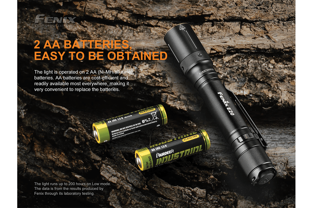 Fenix E20 V2.0 is a lightweight EDC flashlight you'll want to take everywhere. This compact model runs on two AA batteries and boasts a maximum lumen output of 350. It has a single rear switch to power the flashlight and switch between output levels. Plus, it features a 3mm thick patented ultra-thin optical lens, an 85° beam angle, and an A6061-T6 aluminum body. Weighing only 1.4 ounces without the batteries, the E20 V2.0 is as big as a pen and easily attaches to a briefcase or purse making it an ideal everyday carry flashlight.