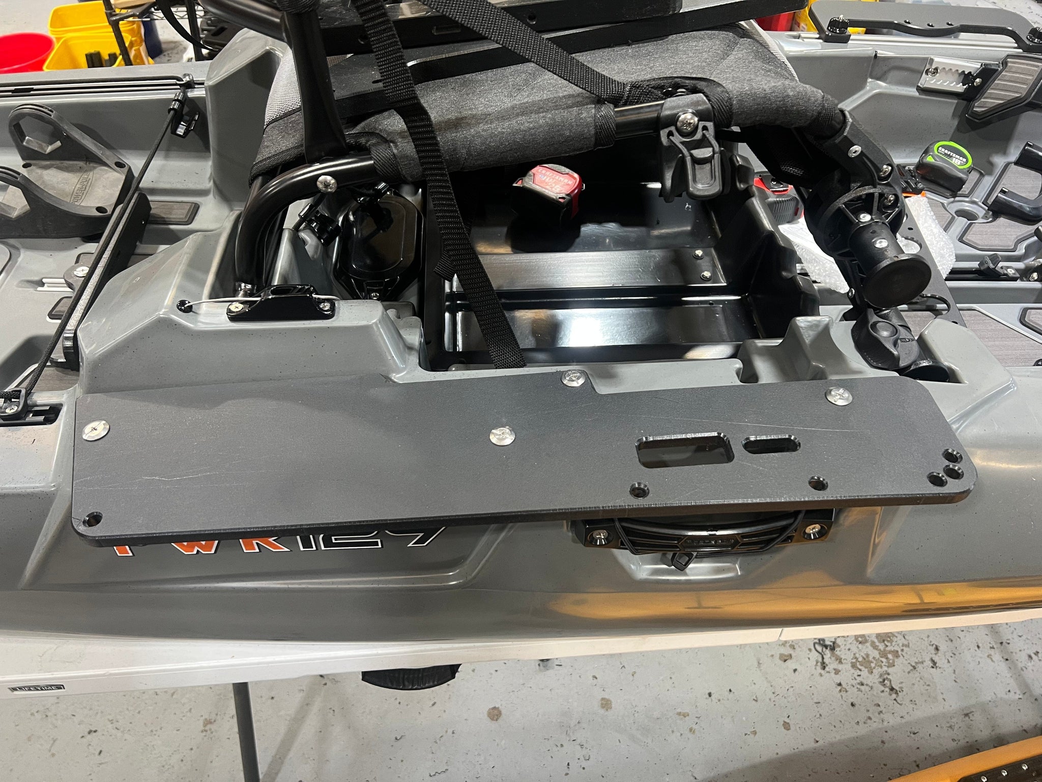 PWR 129. It also has a built in tool holder and places to add lanyards. Accessory Plate will fit the left or right side of your PWR. Comes with hardware to mount to your kayak.