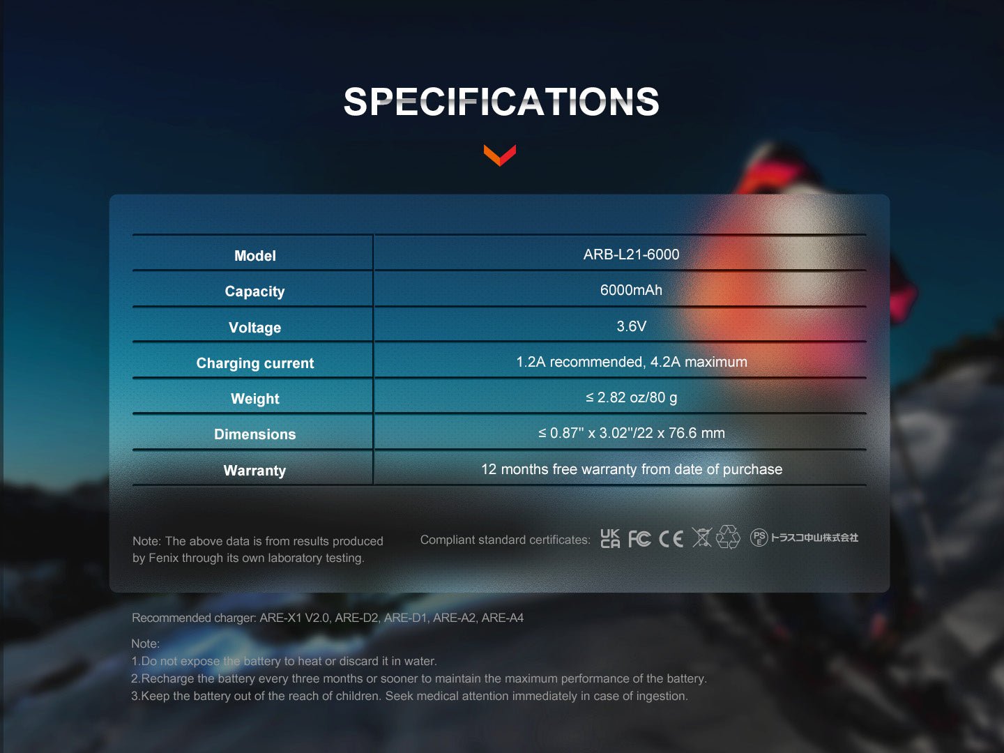 The Fenix ARB-L21-6000 21700 rechargeable Li-ion battery has a capacity of 6000mAh, providing the necessary voltage and power for long-lasting use and increased lumen capabilities. With the same features as other high-quality Fenix batteries, such as internal protective circuits and up to 500 charging cycles, the ARB-L21-6000 can ensure extended runtime and consistent performance. It also offers three sets of overheat protection - pressure relief, microporous, and PTC cathodal block - to maintain the battery's safety and stability. Never be without light; order a spare 21700 battery today.
