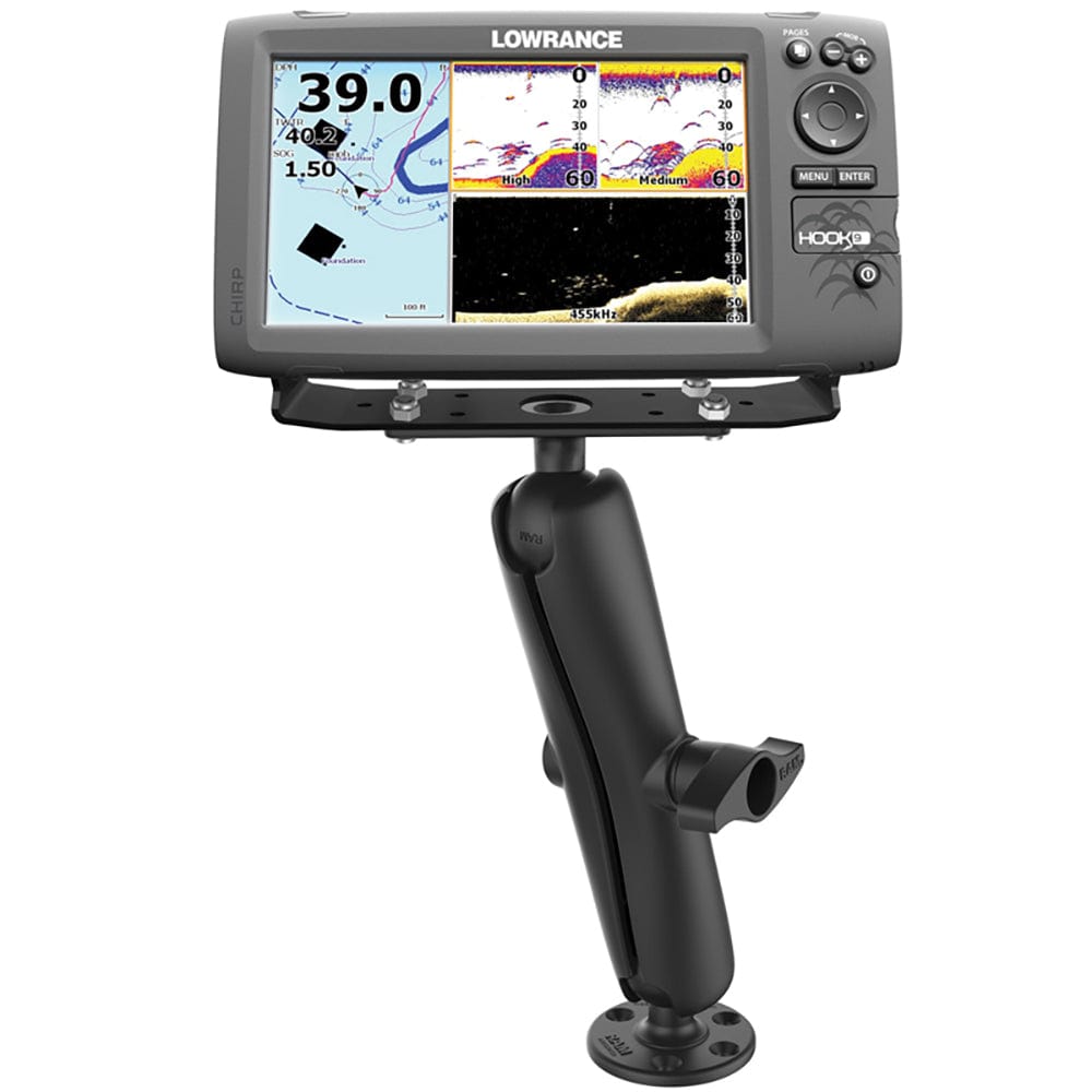 The RAM-D-115-E consists of a base with a 2.25” diameter D size ball, a long arm and a 6.25” x 2” marine electronic plate with a D size ball for supporting larger devices. This marine electronic plate contains different combinations of pre-drilled holes and is a direct fit for 9”-12” fishfinder gimbal brackets. Supports devices such as the Lowrance HDS-9 Gen2 Touch, Garmin GPSMAP 7407 and more.