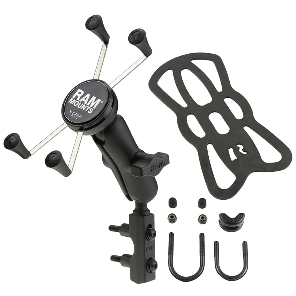 The RAM-B-174-UN10 consists of hardware for mounting to either brake/clutch reservoirs and rails that are 0.5" to 1.25" in diameter, double socket arm and universal X-Grip® large phone/phablet holder. Designed into the mount is a 1" diameter patented rubber ball and socket system with adjustment points at both ends of the socket arm; this with a twist of the arm knob, allows you to move the X-Grip® mount to your optimum viewing position. The mounting hardware for brake/clutch reservoirs include both standard and metric mounting bolts. The included X-Grip® cradle has a clean and clever four leg design that sports great holding power without hiding your phone behind foam pads and plastic. The spring loaded X-Grip® cradle expands and contracts, allowing for a perfect custom fit of your cell phone. The perfect complement to the modern sleek interior of today's vehicles, the RAM X-Grip® is the cell phone cradle evolved. The X-Grip® includes a device tether recommended for outdoor applications. The cradle is compatible with handheld devices that will fit the dimensions listed below. It is important to verify the dimensions of your handheld device with a case/sleeve/skin when determining the overall size.