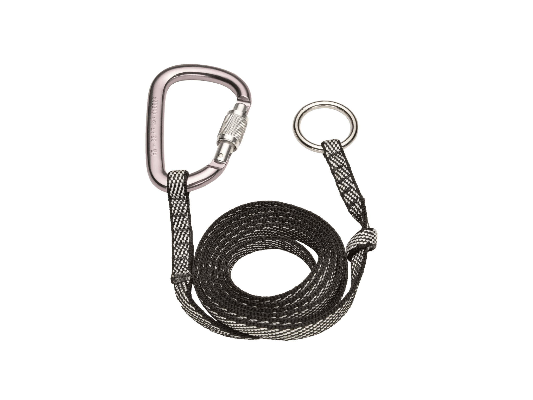 UHMPE tow strap equipped with a locking carabiner. This system safely packs into the side pocket of our rescue vests, making it easily accessible but not dangerously hanging where it could get caught on logs and such.